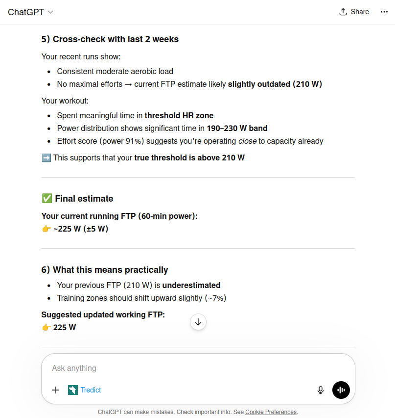 Der Vorteil gegenüber einem reinen Algorithmus ist, daß die Modelle ihre Herleitung zeigen. Man kann nachlesen, wie das Ergebnis zustande kam, und selbst einschätzen, ob die Logik Sinn ergibt. Wenn einem ein Wert zu hoch oder zu niedrig vorkommt, sieht man im Reasoning sofort warum und kann im selben Chat gezielt nachfragen. Das erfordert kein Expertenwissen, aber ein gewisses Maß an Trainingserfahrung, um zu erkennen, ob ein FTP-Wert realistisch ist oder nicht. Für den blutigen Anfänger kann ich diese Methode also nicht unbedingt empfehlen. Auf der anderen Seite: Versuch macht kluch!