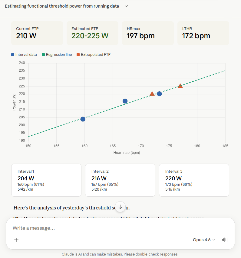 Opus 4.6 hat parallel die Kapazitätswerte, die Aktivitätsdetails und die Trainingshistorie abgerufen und die 10-Sekunden-Zeitserie programmatisch ausgewertet. Die drei Intervalle zeigten: 204 W bei 81% HRmax, 216 W bei 85% und 220 W bei 88%. Daraus wurde eine lineare Regression berechnet (P = 1.21 × HR + 11.3), die bei der Laktatschwelle von 172 bpm exakt 220 W ergab. Mit 2–3% Aufwärtskorrektur für die zurückgehaltene Anstrengung empfiehlt Opus 220–225 W. Besonders schön: Claude hat daraus direkt eine interaktive Visualisierung mit Regressionsgerade und Intervall-Übersicht gebaut.