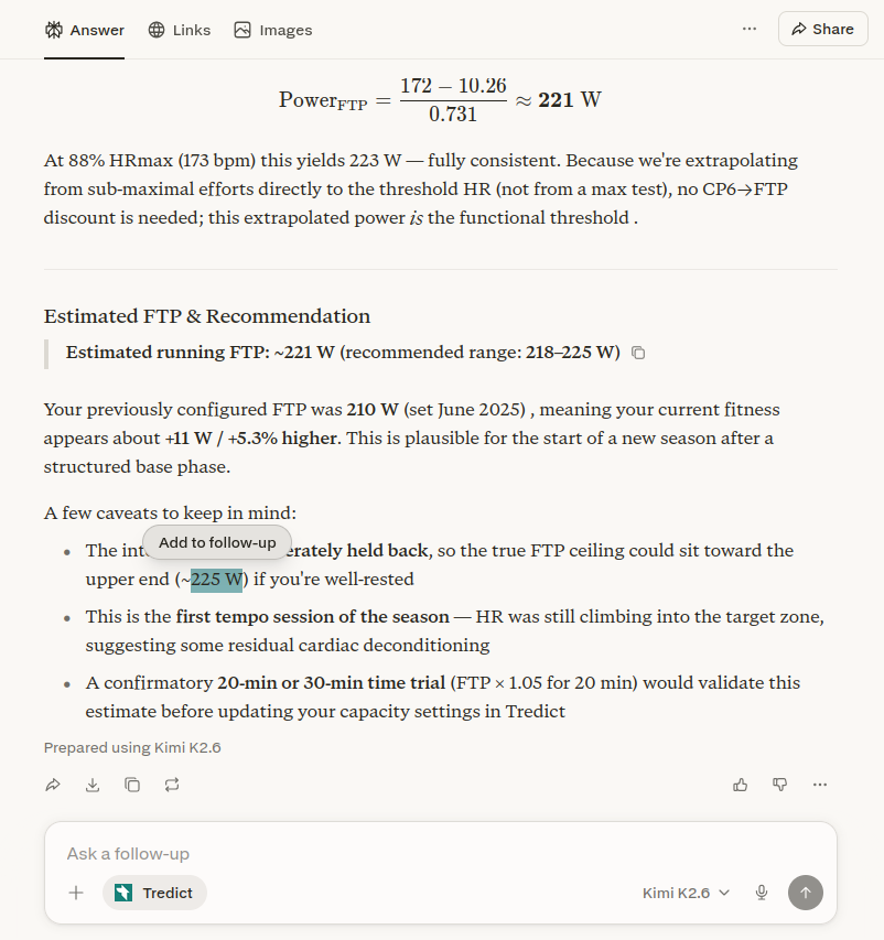 3. Extrapolation auf die Laktatschwelle. Hier liegt der entscheidende Schritt: Bei welcher Leistung würde ich meine konfigurierte Laktatschwellen-Herzfrequenz (172 bpm) erreichen? Das dritte Intervall lag mit 173 bpm bereits fast genau an der Schwelle bei ca. 220 W, und da die Intervalle bewusst zurückgehalten wurden, haben die Modelle eine kleine Aufwärtskorrektur von 2–6% angewendet. Wie man seinen persönlichen Laktatschwellenwert ganz ohne KI bestimmt, erkläre ich ausführlich im Artikel Laktatschwellwert, FTP und FTPa automatisch bestimmen. Und testweise habe ich Kimi K2.6 zusätzlich noch gefragt, ob es mir die Laktatschwellen-Herzfrequenz direkt aus dem Lauf berechnen kann, und Kimi kam auf 170–172 bpm. Genau so wie es bei mir in Tredict konfiguriert ist.