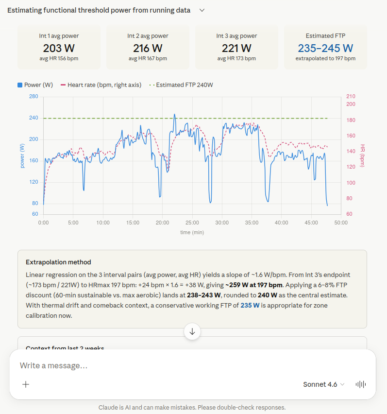 Sonnet 4.6 ist mit 235–245 W der deutlichste Ausreißer nach oben. Sonnet hat die gleichen drei Intervalle identifiziert (203 W / 156 bpm, 216 W / 167 bpm, 221 W / 173 bpm) und daraus eine lineare Regression mit einer Steigung von ~1,6 W/bpm berechnet. Im Unterschied zu den anderen Modellen hat Sonnet aber nicht bis zur Laktatschwelle (172 bpm) extrapoliert, sondern bis zur maximalen Herzfrequenz (197 bpm): +24 bpm × 1,6 = +38 W, also ~259 W bei HRmax. Das ist ein methodischer Fehler! Davon wurde dann ein 6–8% Abschlag für die 60-Minuten-Nachhaltigkeit abgezogen, was auf 238–243 W führt. Als konservativen Arbeitswert empfiehlt Sonnet 235 W. Die Rechnung über die HRmax statt einer direkten Extrapolation auf HRlth ist der Grund für den höheren und falschen Schätzwert. Als Entschädigung zeigte Claude aber dafür die Zeitserien in einem Diagramm an. Denke ich dann beim nächsten 10K-Wettkampf dran, wenn ich auf 8 Kilometer zusammenbreche, hehe.